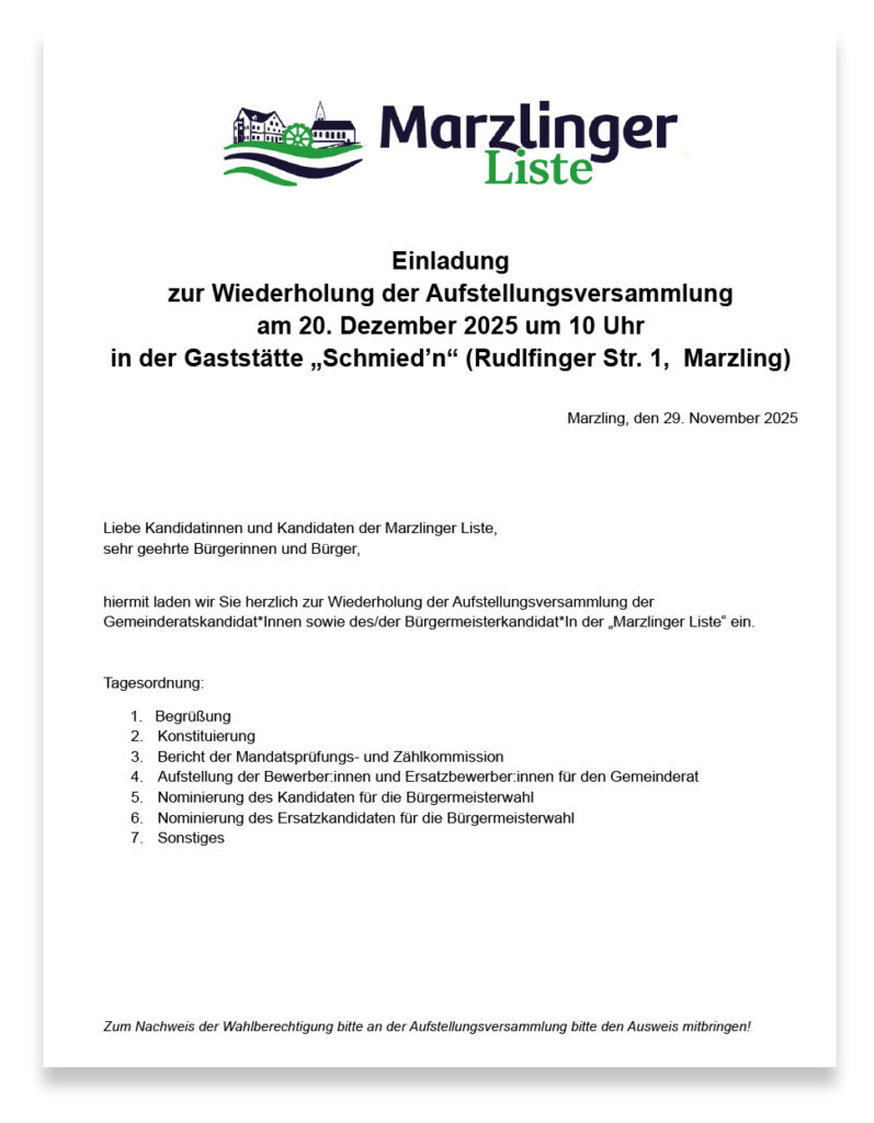 Deshalb treffen wir uns am 20. Dezember um 10 Uhr nochmal mit allen Kandidatinnen, Kandidaten und allen interessierten Bürgern in der Schmied’n zur Wiederholung der Aufstellungsversammlung (in kompakter Version) – und gehen davon aus ab Dienstag, dem 23. Dezember mit den Unterstützerunterschriften starten zu können.